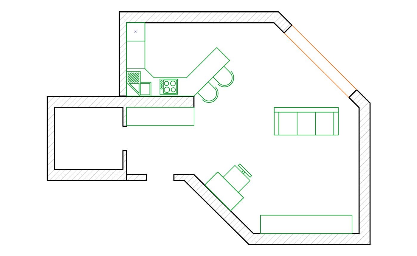 вот, получилось! вот такая квартирка. окно одно на кухню и на комнату. балкон с кухни и перегородка между комнатой и кухней не доконца. ломать стены и переносить их нет возможностей. а так у меня не очень красиво получается