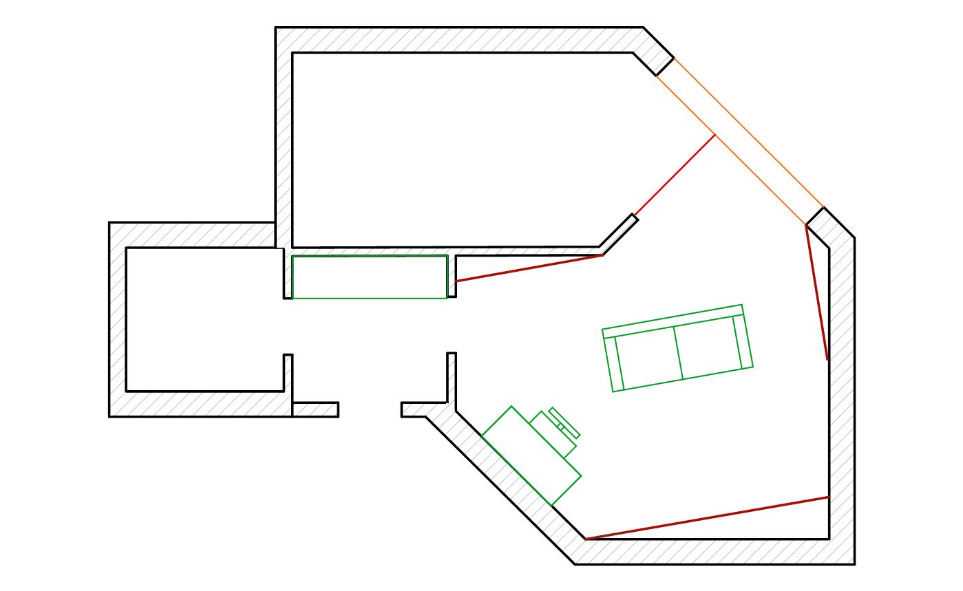 Вот набросала еще один вариант. Тут придется выстроить пару гипсокартонных или мебельных конструкций, это довольно недорого и задаст необходимый нам вектор. Меньшие из них могут служить полками для книг, сувениров, бОльшая - полкой для техники, над ней вешается-ставится телевизор. Паркет или доску необходимо укладывать под тем же углом, что и наши обе конструкции, диагонально.