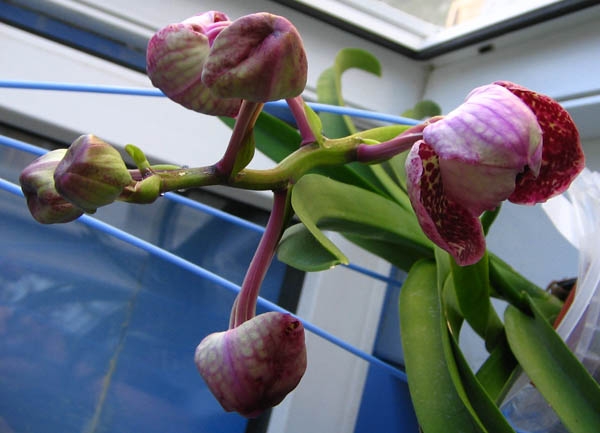Наконец-то начинает распускаться Ванда Bangyikham red x V. Sirstak из Таиланда. Первое цветение, по прайсу пришла как "сеянец", но была уже довольно внушительным подростком