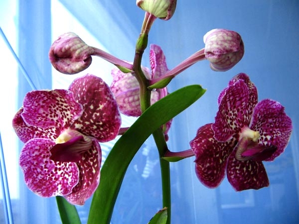 Мне так кажется , что если бы корни висели свободно - цветения бы не было. Цветонос появился через неделю после того, как новые толстые корни упёрлись в стенки горшка и притормозили рост. И ещё я щедро кормила , чередуя 4 вида удобрений, 2 из которых - для цветущих со стимулирующим эффектом. Делала это для того, что бы под новыми листьями (11-12-й) произошла закладка цветоноса, а развитие цветоноса предполагалось через полгода-год. И была просто в шоке, когда увидела его под шестым листом). Ванде предположительно 4 года, по всем интернетовским фото и по увиденным в магазинах реальных - самое раннее цветение у Ванд было при 18 листьях, под 8-10 листом цветонос .Раскидайка писал(а):Юлия, я Вас поздравляю с победой над вандой! Как это удалось?
