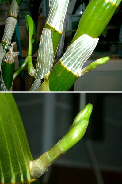 У меня несколько дендров,похожих на Ваш,один из них точно такой же.Я поначалу тоже ждала,пока корешки вырастут до 5-7см,но недавно попробовала отсадить детку почти без корней,они только-только проклюнулись(3-5мм).Была очень удивлена-эта детка вообще не останавливалась в росте,мгновенно укоренилась в коре и почти догнала отсаженных ранее братьев :shock: (один был отделен в марте прошлого года,другой в сентябре).Мне кажется Вам пора отделять детей $:023