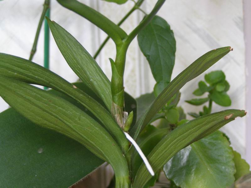 Несколько месяцев назад появилась у меня маленькая деленочка дендра-фаленопсиса- от красивой белой мамы.Я так старательно её поливала, что залила .В итоге- те два листочка, которые были зелёными- пожелтели и отпали.Стояла она голой палочкой да еще и без корней(их я обрезала), прошло 2 месяца и моя палочка стала творить чудеса: ВЫПУСТИЛА ЦВЕТОНОС и маленький боковой ростик!