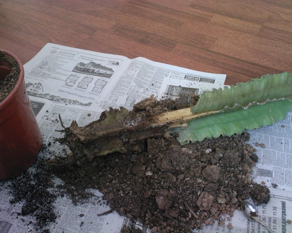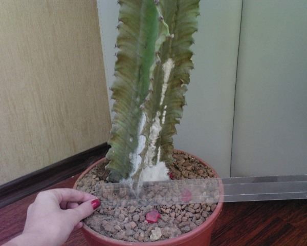 Кактус снизу покрылся плесенью.Плесень белая пушистая,снизу на стволе. Он стоял за креслом и я просто не видела что там твориться в горшке. Поливала ну очень редко. В горшке сухо, но принадавливании на ствол с одной стороны видно, что он гниет. Помогите, может можно еще спасти.