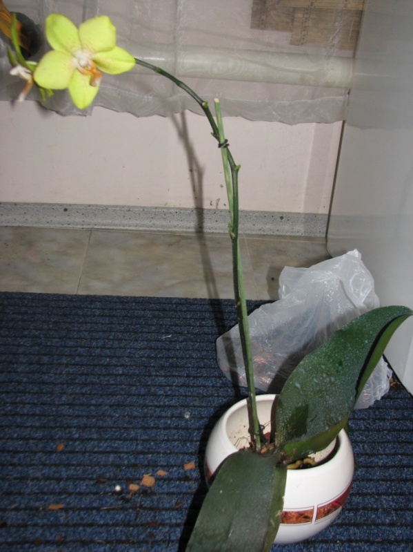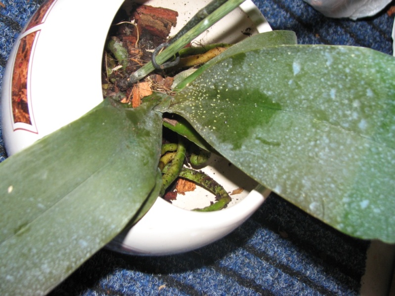 Ребят подскажите, есть ли будущее вот у этой орхидейки. я прочитала эту тему недавно, но еще ранее в парочке местах прочитала, что можно проктиковать горячий душ. я решила сделать на 1 орхе, т.к. кроме того, что она цветет есть на 1 см вылезшая почка и она стояла на месте уже несколько месяцев. Вот я и сделала небольшой душикгоряченькой водичкой но руку можно было удержать. Но получилось что листья просто напросто сварились. стало видно это через пару дней. хотя мне не понятно - она цветы не сбросила, так держатся 2 цветка. На фото сильно не видно, но 70% листа мякгая и коричнегого цвета. Кроме того в начале листа появились белые точечки. вредителей нет. я вытащила ее из субстрата для того, что б проверить. на фото как раз без него. Подскажите, чего можно сделать для реабилитации и выживетли она вообще. Оч буду всем благодарна. Жалко растеньку, была крепенькая.