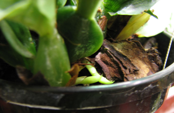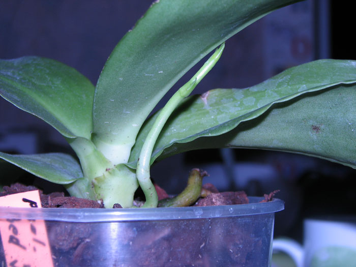Stanhopea - цветонос лезет у основания бульбы, как и новый рост, но новый рост направлен вверх, а цветонос направлен вбок или вниз. протыкает субстрат и вылазит внизу горшка.