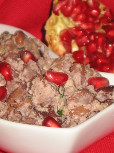 Очищенные и молотые ( можно и толчённые) грецкие орехи , мелко резаную зелень и специи перемешать добавить гранатовый сок и размешать , соединить с фасолью с луком. Перед подачей посыпать зернами граната