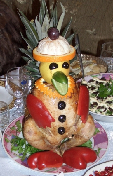 А можно приготовить еще и такую курочку-"Тетушку Молли". От вас потребуется стандартная курица, немного фруктов и овощей для "фасада" и буйный разгул фантазии.