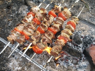С вечера порезала кусками свежее мясо (задняя часть, можно ошеек но я не люблю очень жирное) посолила, добавила специи для шашлыка ( на Дарницком базаре продают на развес какие хочеш , я там всегда беру стопочка 5 грн., ну очень СУПЕРОВЫЕ). Далее майонез Олком провансаль, все перемешала и выложыла в кострюлю слоями слой мяса, слой лука репчатого порезаного на 4 части ( кольцами я не режу т.к. потом при жарке спадает, и помидоры тоже лучше на 4 части ( лучше держаться) поставила в холодильник. Утром на природу.