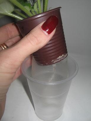 Одна из простейших это берём коробку из под сока и вырезаем лезвием в ней отверстия равные окружности дна стаканчика.В коробку вместимость воды 1,5литра,на месяц можно забыть о поливе.