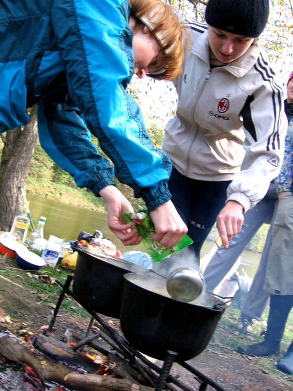 В первый день первой проблемой было то, что нас привезли в такое место, где очень мало сухих деревьев, быстро потемнело и мы лазили по кустам в темноте выискивая хоть-какие-нибудь дрова для костра (а было очень сыро, холодно и голодно). Среди ночи варили кушать и довольно поздно лягли спать- гдето в 01.00. Утром проснувшись, было очень трудно подняться из-за недосыпания и зверского холода!!! Со спальника я вылазила пол часа точно. Все вокруг было в сметанном тумане и иние, на палатке наблюдалась корочка льда. Но возле костра тепло и сухо.