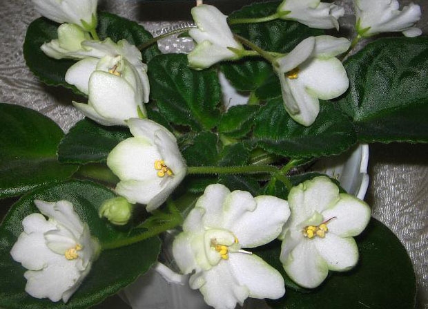 Крупные махровые и полумахровые тёмно-красные цветы очень красивой формы, весь цветок фигурно-выемчатый и его лепестки напоминают язычки пламени. Изумрудно-зелёная выставочная розетка из заострённых листик