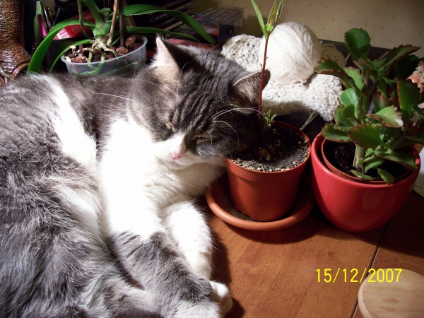 Svetka, Барсик - лапочка. Мой кот тоже любит в цветах поспать. А у меня там еще подстилочки шерстяные в цветнике - для тепла, так его оттуда вообще не согнать. Раньше еще и кошка туда лазила, но сейчас растолстела, не получается у нее. :)