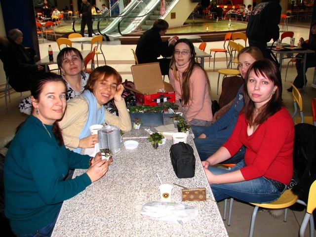 Кстати, место действительно очень удобное. Нас там много поместилось вместе с цветами, тепло и уютно. А я обнаружила, что в Макдональдсе бывает зеленый чай. :shock: Правда, холодная его разновидность была в бутылке и, подозреваю, имела к чаю отношения мало. ;-)