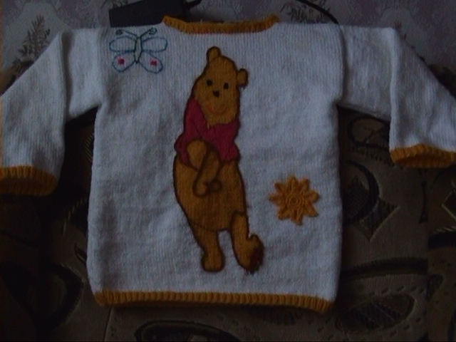 Мой свитер дочке с Винни Пухом. Брат сказал, что Пух похож на тюленя. Критикой, как всегда, я не обделена.