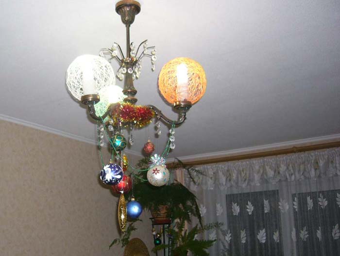В результате предновогодней уборки и несчастного случая с одним из плафонов у нас получилась такая новогодняя люстра. Думаю если шары делать из блестящих ниток будет более празднично.