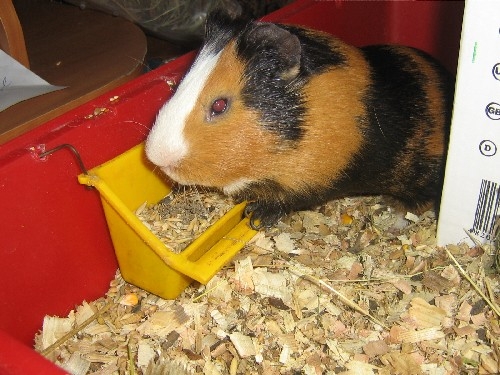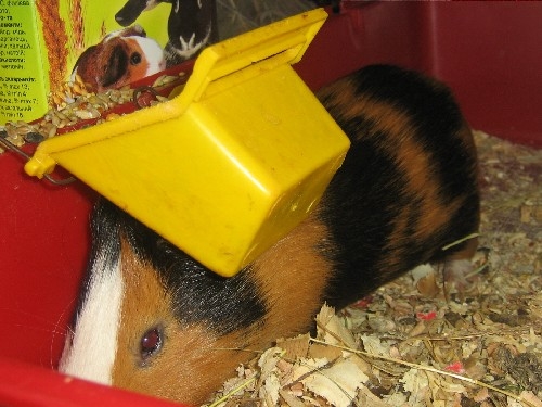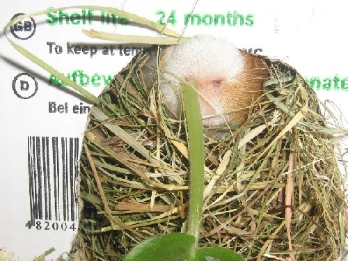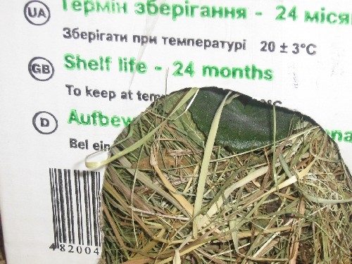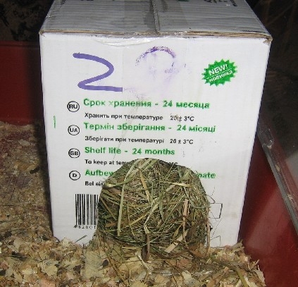Поставили Мишке новый домик. Он ему очень понравился. Сразу же забрался в него, дверь сеном забил и затих на целый день. Видимо проникся надписями "NEW" и "Срок хранения 24 месяца." Обмозговывал, выдержит ли он 24 месяца не жрать свой дом.