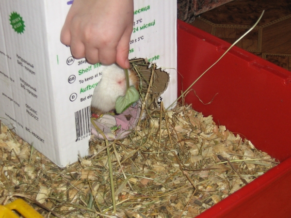 Миша практически все время теперь сидит в этой коробке, пардон, в этом домике. Выходит только если мы его выманиваем или если захотелось пожевать чего-нибудь. Хотя сено он жует не выходя из дома.