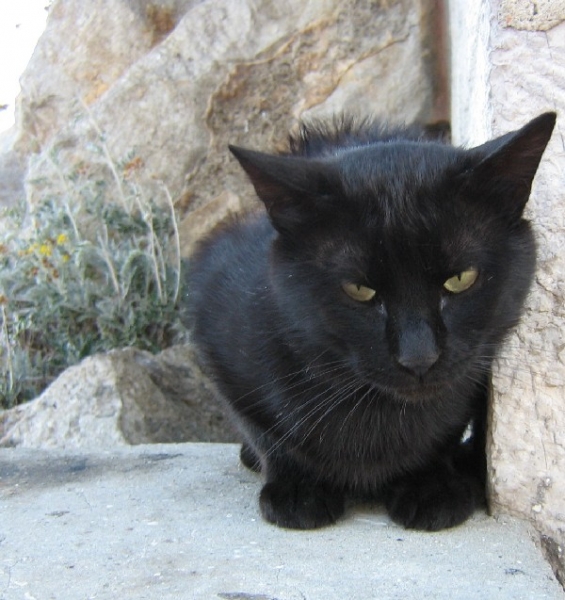 Он сидит на перилах, а внизу - огромная пропасть и скалы, торчащие из моря. Ветер (там довольно приличный) взъерошил ему шерсть на спине. Он так смешно посматривает на туристов, типа: "Ну вот, опять следующая группа ненормальных с фотоаппаратами притащилась... Ходют тут всякие, а потом мой корм пропадает." Внизу под перилами стоит огромная миска и из нее с чавканьем торопливо ест рыжая дворняжка, не обращая внимание ни на кота, ни на туристов: "Не каждый день перепадает в валютном ресторане пообедать! Надо все схавать побыстрее и тикать, пока счет не принесли!".