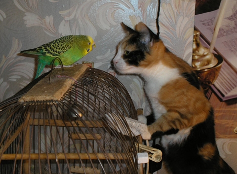 Я по-началу боялась их оставлять одних. Рики закрывала в одной комнате, Кеську в другой, потом просто хорошо запирала клетку (Рики очень любит открывать дверцу клетки и выйти погулять, так как летать не очень любит), но это не помогало. Попугайша как-то умудрялась открывать её. Потом я несколько раз приходила домой и видела такую картину - Рики гуляет на полу, а Кесси за ней следит, но не нападает, а как только приближается к ней, Рики начинает кричать (а кричит она хорошо, аж уши закладывает) и пытается клювануть кошку, Кесси естественно пугается от такой неожиданной атаки и убегает