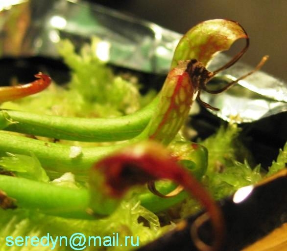 Моей Дарлингтонии калифорнийской всего 2 года. Но уже и сейчас можно разглядеть "змеиную" головку этого интереснейшего хищника. Взрослым растение становится на 5-6 год.