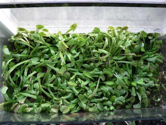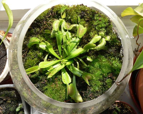 Вообще венериной мухоловке нужен яркий свет, но главное чтоб было влажно и сустрат полностью никогда не пересыхал, и не была герметичной емкость в которой она содежится. У меня уже несколько лет растет благополучно один экземпляр в круглом аквариуме, в чистом сфагнуме, на ярком солнце, я ее периодически делю, рассаживаю. У нас летом температура повышается до 35. Вообще температура более 30 для мухоловок не очень хорошо, но терпят нормально, там на родине и повыше бывает. Какая влажность я сказать не могу, но растениям хорошо и комфортно, влажность поддеривается в большом прямоугольном и малом круглом открытых аквариумах исключительно за счет влажного мха на нужном уровне, им хватает. А вот непентесу мало, на фото справа его чуток видно, но прет вверх, уже 1м 80 см.