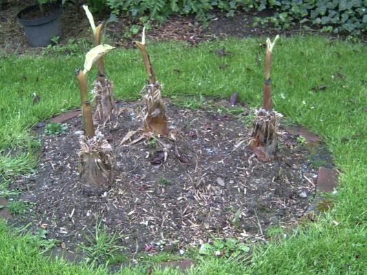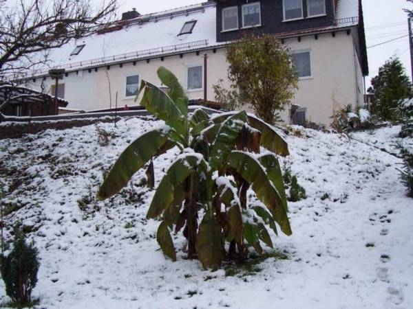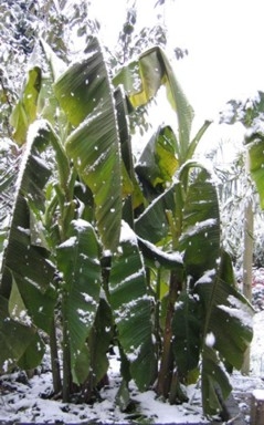 Интересный конечно вид,когда жил в Крыму, то наблюдал его в Никитском ботаническом саду. Его на зиму (корневища) присыпали сухими листьями, чтобы если будут морозы, то не повредили их. Они почему-то у них были наполовину в оголённом состоянии, не знаю почему сотрудники сада не присыпали их землёй. Но это наверное для перестраховки, т.к. был там в январе, ходил в одном свитере, а когда солнышко появится, так вобще весну напоминает. Точно не скажу, но слышал, что Musa basjoo выдерживает понижение температуры до –20 градусов! В регионах где температура опускается ниже этого уровня, умудряются выращивать его в открытом грунте. Просто на зиму извлекают корневища из земли и хранят их в прохладном месте до весны. А по наступлении весны снова высаживают в открытый грунт. Вобщем как многолетние цветы. И растёт также как на родине, правда до цветения дело не дойдёт точно.