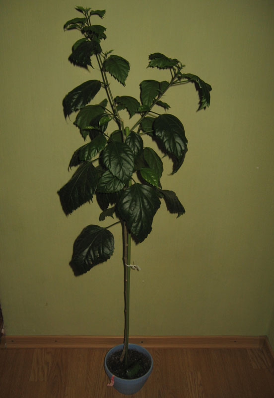 Началось все с того, что посаженый черенок гибискуса был очень ровненьким и мне захотелось сделать с него штамб. С высотой долго не могла определиться, но по мере его роста у меня все прибавлялось растений, которые в итоге на подоконнике уже помещались струдом. По сему решила, что лучше бы стоять ему на полу возле окошка- соответственно высота штамба должна быть таой, что б растение, стоя возле окна нормально освещалось солнышком. Чесно говоря высоту не меряла- так на глаз.
