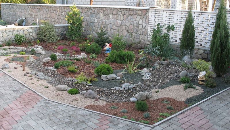 . А потом сыпем где кору, где мрамор, а где и гравий. Если на гравий высаживать хвойники и краснолистные растюхи получается очень даже ничего. Я попробую найти фото где вообще на гравии высажены серолистные вещи. Гравий посто самый экономичный вариант, а агроволокно позваляет в десятки раз сократить время на уход.