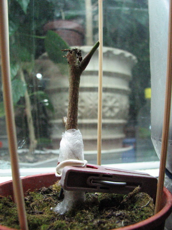 А сегодня была попытка номер два. Подвой был достаточно взрослый, поэтому проблем втыкания привоя небыло. На этот раз у меня привой из позвоя выскальзывал. Постаралась как могла, чтобы зафиксировать его вровень.