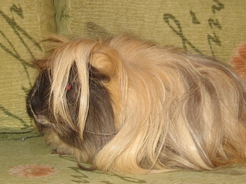 А мой Пэпа надменный стиляга. Линяет жутко. На пузе подержишь, затем надо щеточкой шерсть убирать. Пэпа у нас перуанская длинношерстная или ангорская морская свинка. Расчесываем, колтуны на попе срезаю ножницами. Расчесываю аккуратно, но он все равно пищит. Зато потом, как Йокширский терьер. Я его называю- Йокширский терьер для бедных