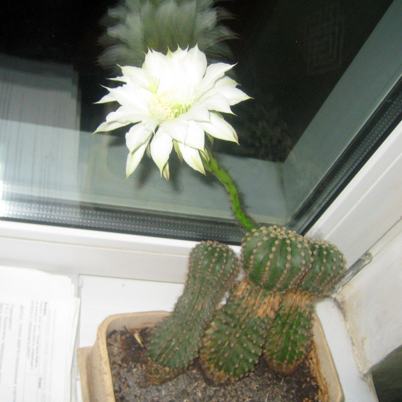 Мой кактус. Первый раз зацвёл в возрасте 5 лет. Выпустил 2 цветка с периодом 2 недели. Цветение -одни сутки.
