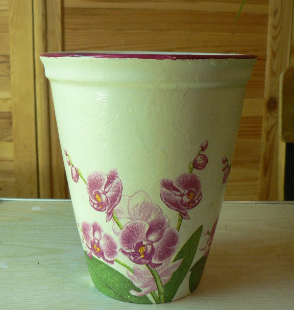 Горшок я делала так же, только мотив орхидеи я вырезала из салфетки (на коробке полностью салфетку использовала) и плюс ободок дорисовала по краю горшка.
