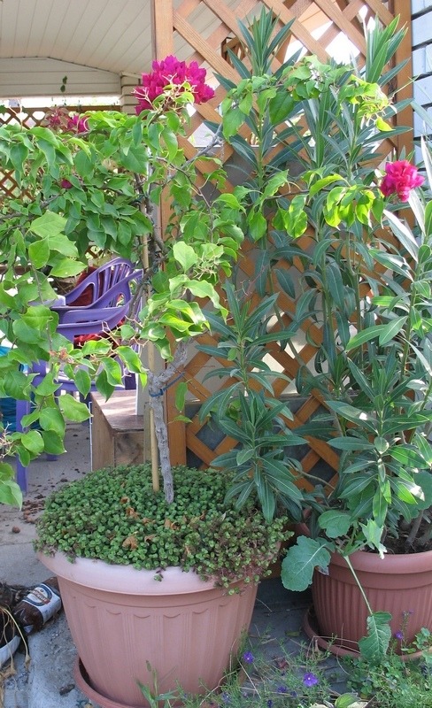 Привезла себе 6 лет назад из Австралии малиновую бугенвиллею.Она у меня цвела каждое лето,листья были как у сирени-такие большие,листву на зиму сбрасывала-я её на зимовку оставляла на балконе застекленном.А эту зиму я её видимо перелила немного и она весной уже почернела.