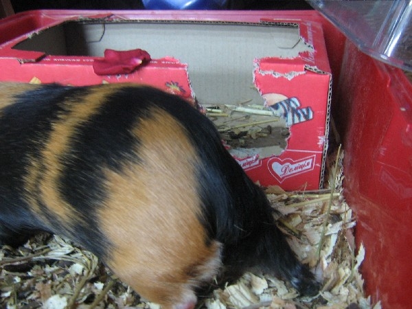 Миша практически все время теперь сидит в этой коробке, пардон, в этом домике. Выходит только если мы его выманиваем или если захотелось пожевать чего-нибудь. Хотя сено он жует не выходя из дома.