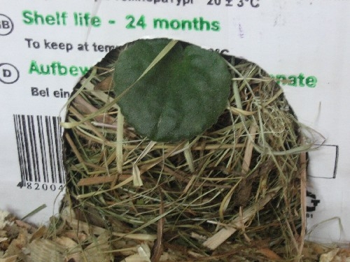 Нам эта тишина(за целый день - ни шороху) надоела и решили его выманить. Первый лист был захвачен и съеден моментально (не отгребая сена).