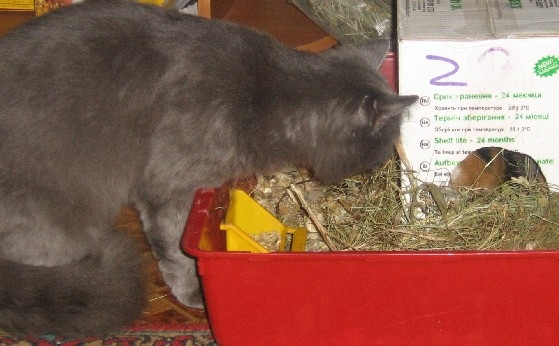 Коту скучно дома. Он пристает к Мишке, чтобы поиграться. То с одной стороны посидит, то с другой, то прямо в дырку пытается заглянуть. Уже и сверху лазил, лапой по крыше тыкал-стучал. Типа вызывает Михасыка: "Выходи, поиграем!" А Мишка только морду чуть-чуть показывает, вроде дразнится. Смоки уже и в сам террариум влазил, а Мишка сидит себе в домике и в ус не дует. Котик и в кормушку свинскую влез и вокруг потоптался. Свин не реагирует. И тогда Смоки совершил ошибку. Он попытался засунуть лапу вовнутрь домика. Вот тут я очень пожалела, что у меня нет кинокамеры. События развивались так стремительно, что фотоаппарат не справлялся с задачей. Некоторые фото получились совсем смазанными. Так что попрошу поверить мне на слово.