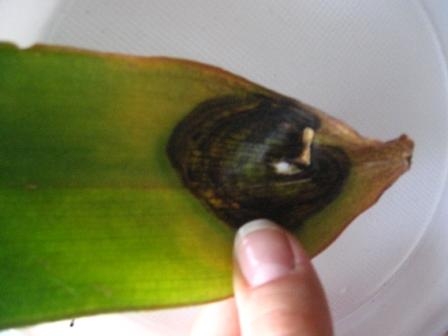 У двоих фаликов присходит что-то непонятное с листьями. Сначала пожелтели(в определенном месте), потом у одного из них появилось черное пятно. Но оно было маленьким теперь вот такое. Увеличелось раза в три. Возможно, это ожег, но почему тогда чернота расползается??? Думаю резонуть это безобразие, но у другого фалика ЭТО у основания листа, прийдется весь листок оторвать. Хотя там пока только первая стадия того, что на другом листике. Эксперты, что делать?