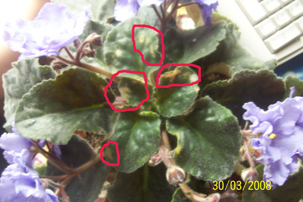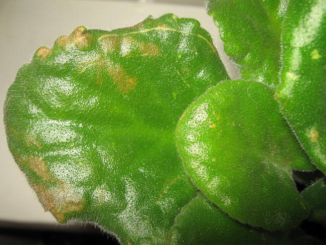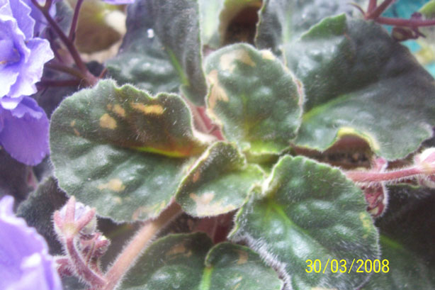 Да, девочки правы. У меня такое было после переезда в мороз. Пока все фиалки загрузили в машину, первые немного подмёрзли и остались такие желтенькие пятнышки и разводы.